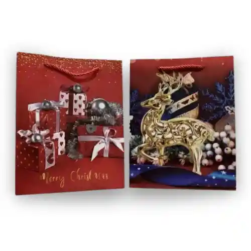 Bolsa De Regalo Navideña Escarchada Cartulina Fina Lisa Talla M : ALTO: 23CM, ANCHO: 18CM ¡Celebra la magia de la Navidad con nuestra Bolsa de Regalo Navideña Escarchada de Cartulina Fina Lisa en Talla M! Diseñada para realzar la presentación de tus regalos, esta bolsa combina la elegancia de la cartulina fina lisa con un toque festivo de escarcha, creando un envoltorio que es tanto encantador como funcional.