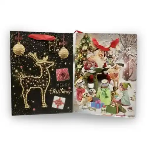 Bolsa De Regalo Navideña Relieve Escarchada Cartulina Fina Lisa Talla M : ALTO: 23CM, ANCHO: 18CM ¡Celebra la magia de la Navidad con nuestra Bolsa de Regalo Navideña Escarchada Con Relieve de Fina Lisa en Talla M! Diseñada para realzar la presentación de tus regalos, esta bolsa combina la elegancia de la cartulina fina lisa con un toque festivo de escarcha, creando un envoltorio que es tanto encantador como funcional.