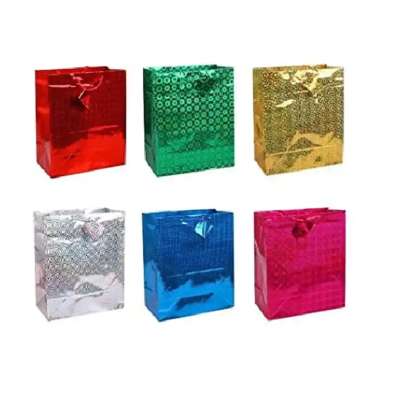 Bolsas de regalo metalizadas surtidas Elegantes bolsas de papel con acabado metalizado y texturas brillantes en colores surtidos azul dorado rojo verde plateado rosado y fucsia Ideales para envolver regalos de forma practica vistosa y con estilo Cuentan con asas resistentes y diseño llamativo para cualquier ocasion especial EL COLOR SE ENVIA ALEATOREAMENTE