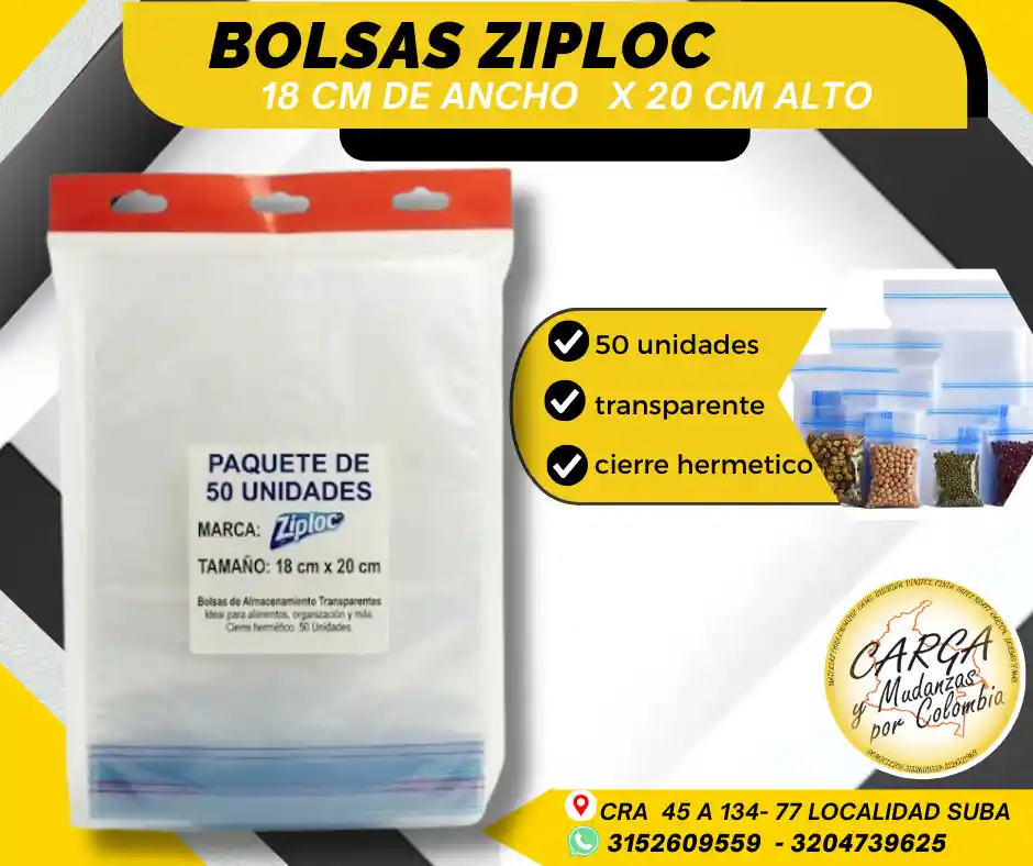 Las bolsas Ziploc son empaques versátiles con cierre hermético (tipo zipper) diseñados para preservar la frescura de alimentos, organizar objetos pequeños y transportar artículos con seguridad, evitando la entrada de aire y humedad. Son reutilizables, transparentes y resistentes, ideales para congelar, marinar o empacar snacks. Alta Calidad - Producto Garantizado. Visítanos: Cr. 45a # 134 - 77 Local Esquina Contáctanos: 315 2609 559