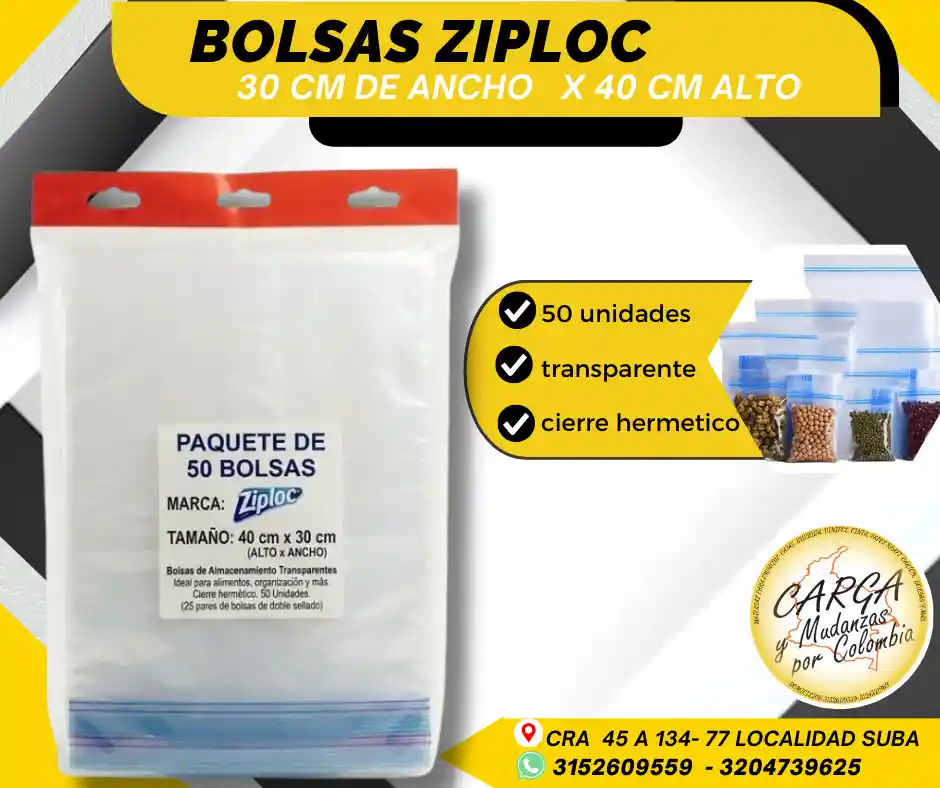 Las bolsas Ziploc son empaques versátiles con cierre hermético (tipo zipper) diseñados para preservar la frescura de alimentos, organizar objetos pequeños y transportar artículos con seguridad, evitando la entrada de aire y humedad. Son reutilizables, transparentes y resistentes, ideales para congelar, marinar o empacar snacks. Alta Calidad - Producto Garantizado. Visítanos: Cr. 45a # 134 - 77 Local Esquina Contáctanos: 315 2609 559