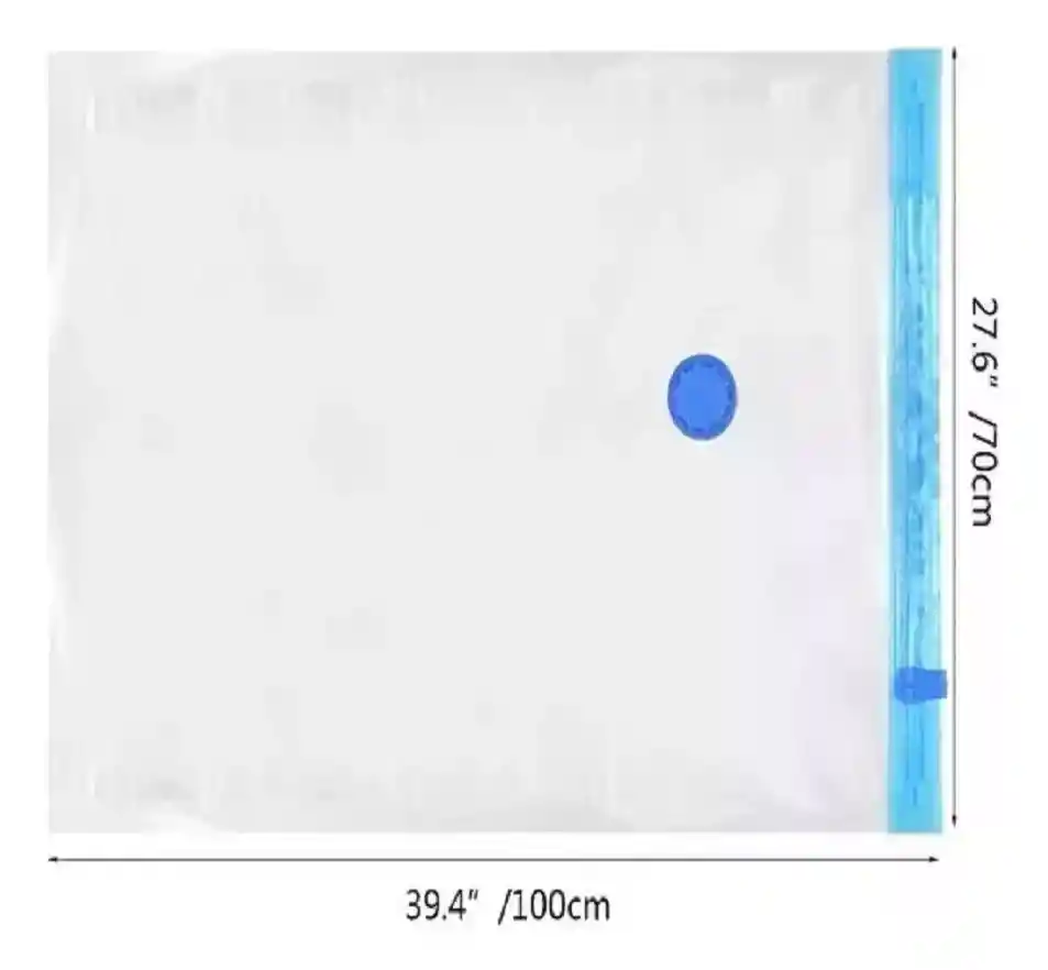 Set de cinco bolsas herméticas de empaque al vacío de 100 x 70 cm, que incluye una bomba. Estas bolsas son ideales para viajar, adaptándose a maletas de diferentes tamaños y perfectas para guardar pequeños artículos del hogar. Son especialmente útiles para almacenar objetos voluminosos como cojines y cortinas, así como para la transición de ropa de verano a invierno. Fabricadas en material PA y PE resistente, son reutilizables y permiten volver a empacar para el viaje de regreso. Cuentan con tecnología de sellado de doble cremallera que ofrece resistencia industrial, asegurando funciones herméticas e impermeables, protegiendo tus objetos de malos olores, bacterias y otras partículas dañinas. Estas bolsas reducen el volumen inicial de los objetos entre un 50% y un 95%, siendo ideales para empacar o colgar ropa delicada o alimentos, especialmente en viajes largos donde el espacio es limitado.