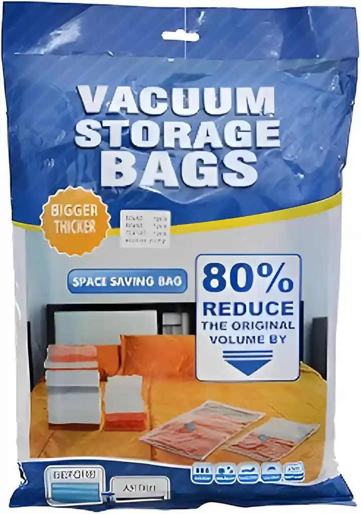 Bolsas al vacío ideales para almacenar ropa, cobijas, edredones y textiles reduciendo hasta un 80% del volumen. Fabricadas en material resistente y reutilizable. Funcionan con aspiradora para extraer el aire fácilmente y optimizar espacio en clósets, maletas o mudanzas. ✔ Reduce volumen hasta 80% ✔ Reutilizables ✔ Protección contra polvo y humedad ✔ Ideales para viaje y almacenamiento