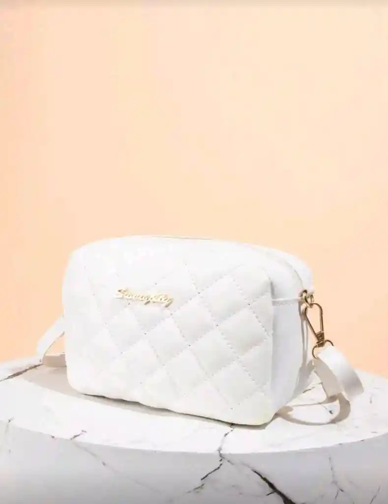 Bolso en tono blanco con diseño acolchado en patrón de rombos. Elegante y versátil, ideal para combinar con cualquier outfit, desde casual hasta formal. Cuenta con correa ajustable y cierre superior con cremallera para mayor seguridad.