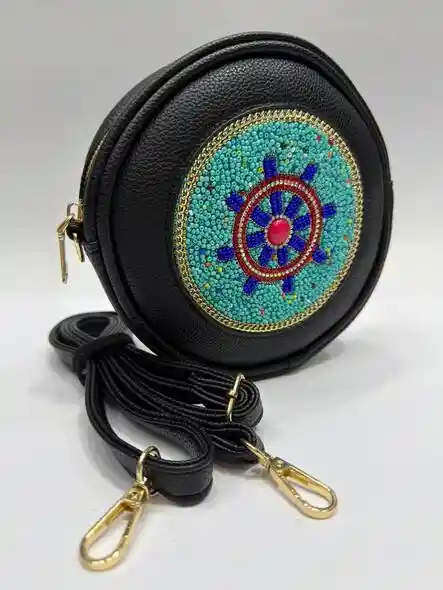 Este exclusivo bolso redondo combina elegancia, tradición y estilo contemporáneo. Elaborado en cuero negro de alta calidad, destaca por su hermoso bordado artesanal en chaquira, cuidadosamente trabajado a mano para crear un diseño circular lleno de color, textura y significado. Cada detalle refleja la dedicación y el arte de la joyería textil tradicional, convirtiéndolo en una pieza única. Sus herrajes dorados aportan un toque sofisticado que contrasta perfectamente con el cuero negro, mientras que su correa ajustable y desmontable permite usarlo de diferentes formas: al hombro o cruzado, adaptándose a cualquier ocasión ✨ Características: Cuero negro resistente y elegante Bordado artesanal en chaquira multicolor Diseño redondo moderno y distintivo Herrajes metálicos en tono dorado Correa ajustable y desmontable Medidas:19x19 cm