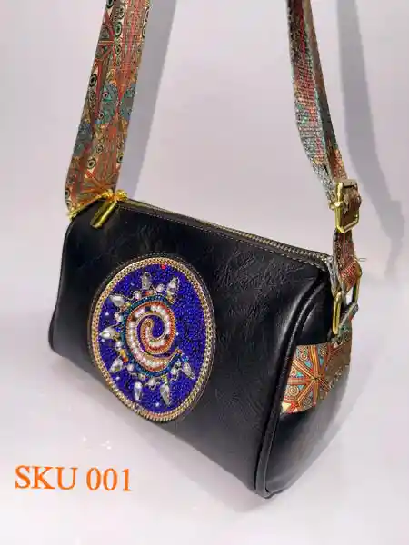 Bolso crossbody artesanal combina elegancia, color y personalidad en una pieza única.Material tipo cuero vegano de alta calidad, destaca por su aplicación frontal bordada a mano, inspirado en formas espirales y detalles brillantes que aportan un toque artístico y sofisticado. Cuenta con cierre superior de cremallera en tono dorado que brinda seguridad y un acabado premium. Su correa ajustable de tela estampada multicolor añade contraste, comodidad y un estilo moderno, ideal para usar cruzado o al hombro. Perfecto para quienes buscan elegancia pero con carácter, ideal para uso diario, salidas casuales o para elevar un look sencillo. 20x20 cm, 10cm ancho mas correa.