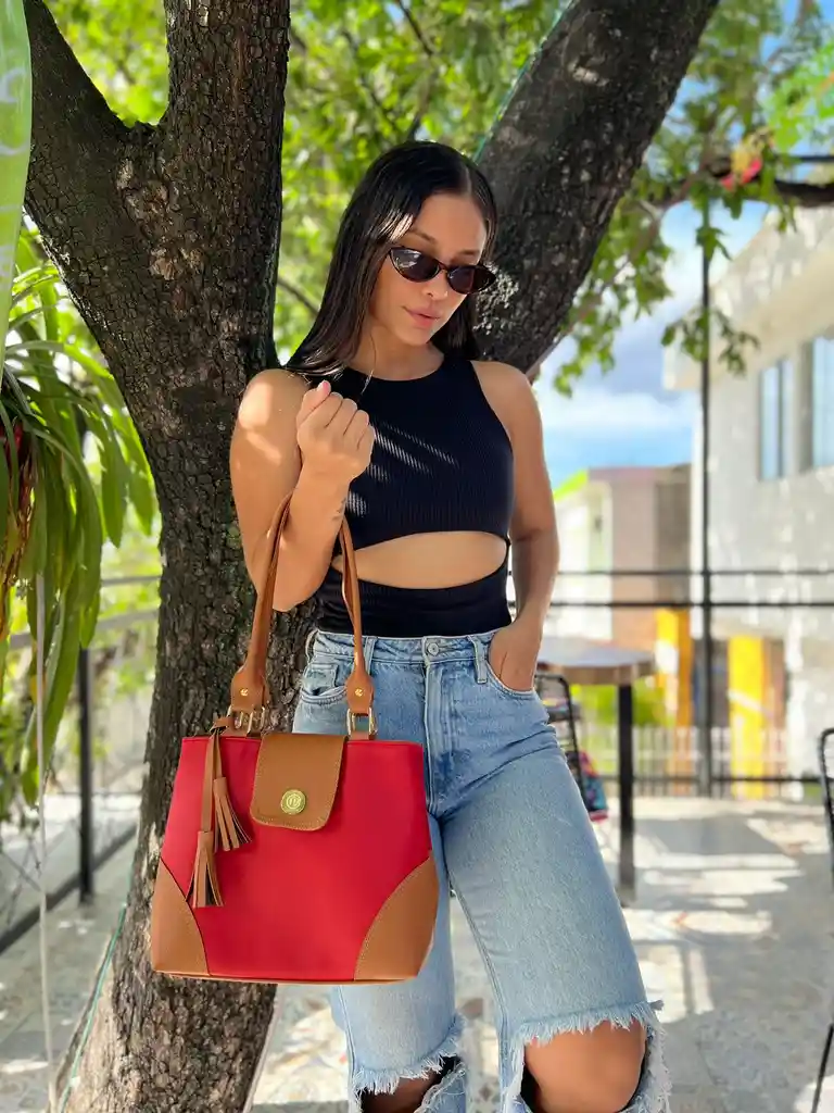 •Bolso clásico •2 compartimentos •Material sintético invita •Alto 24 cms •Ancho 32 cms
