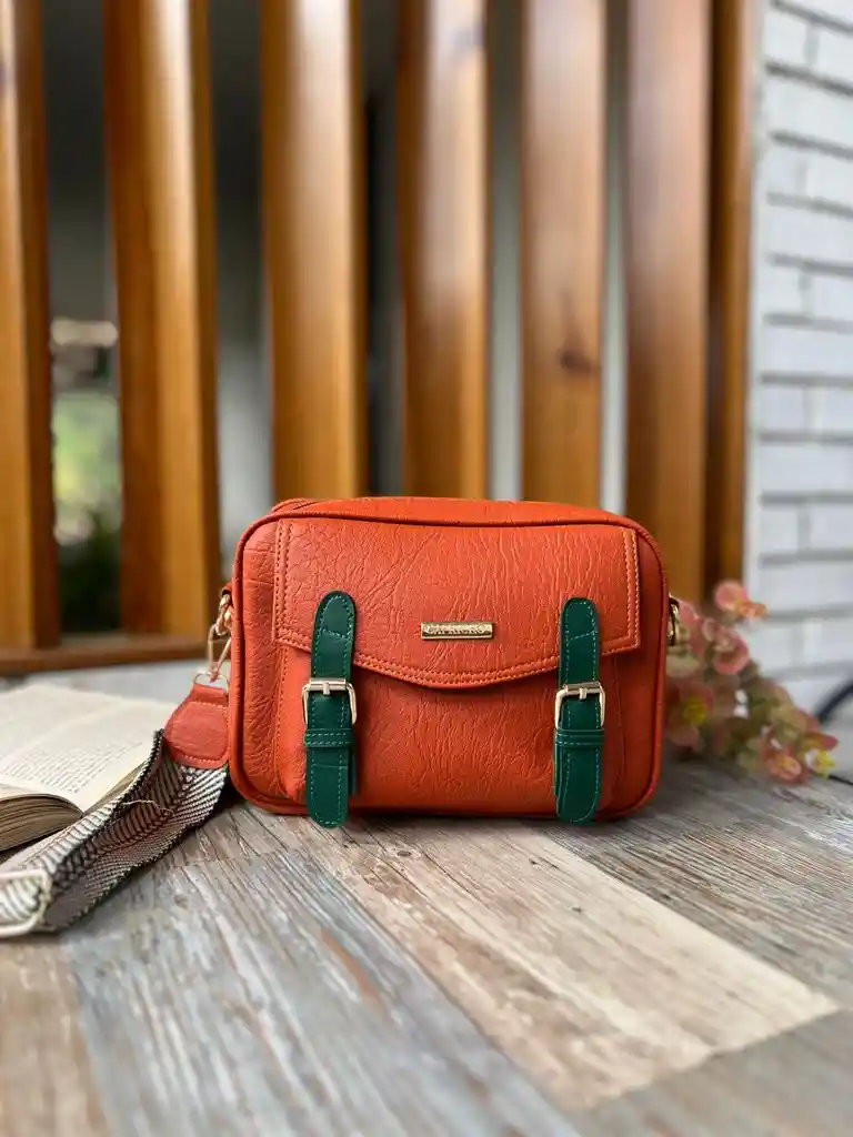 •Manos libres •Material sintético enquesillado •Herrajes de lujo dorados •Alto 20 •Ancho 26