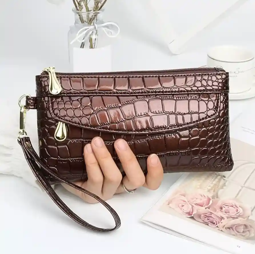 Bolso de mano tipo sobre, billetera elegante, cartera pequeña para mujer, patrón de cocodrilo con cierre de cremallera, diseño minimalista, ideal para trabajo o viaje, resistente, regalo perfecto, versátil, elegante y funcional, accesorio premium para amantes de la moda. Ideal para complementar tus outfits diarios, está fabricado con materiales de alta calidad que garantizan durabilidad y estilo. Color marrón rojizo. Características Principales: • Interior: Tiene un bolsillo interior en el medio de cremallera y un espacio a cada lado. • Exterior: Contiene dos bolsillos exteriores con cremalleras, uno en cada extremo. • Material: Cuero sintético. • Forro interior: Poliéster. Dimensiones: • 11cm alto x 21cm ancho. Detalles del Diseño: • Tira pequeña de agarradera, correa de muñeca. • Cremallera suave de metal color dorado. • Cuero PU sintético de calidad. Capacidad de Almacenamiento: • 1 Bolsillos interior y espacios, 2 bolsillos exteriores.