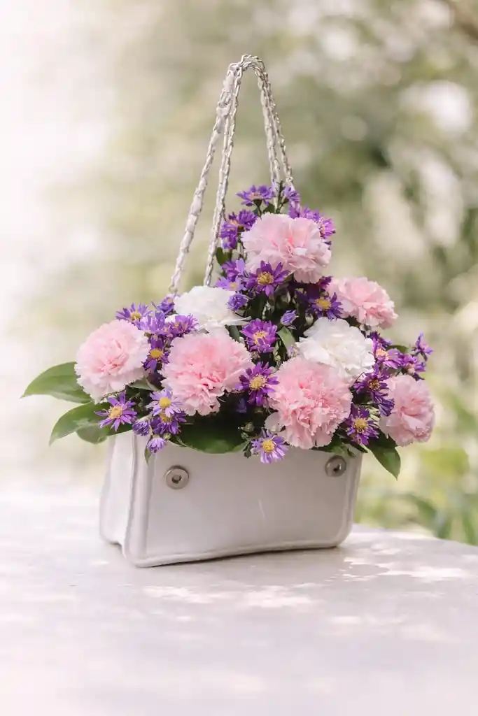 Un arreglo elegante y diferente dentro de un bolso tipo cartera, lleno de flores frescas en tonos suaves. Perfecto para sorprender con un detalle moderno, chic y súper exclusivo. Ideal para cumpleaños, aniversarios o regalos especiales.