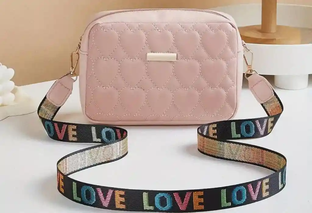 Bolso en color rosa pastel con diseño acolchado de corazones, femenino y delicado. Su correa ancha con estampado multicolor “LOVE” le da un toque juvenil y divertido. Compacto y práctico para llevar lo esencial con estilo.