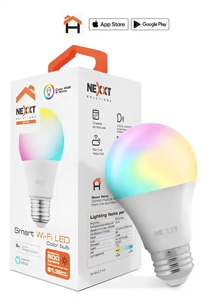 America Store te trae Bombillo Inteligente LED NEXXT WiFi 110V Multicolor Ref. NHB-C110 Características destacadas Brillo regulable con ajuste de intensidad para cada color Programación de horarios de encendido y apagado Control por voz compatible con Amazon Alexa y Google Assistant Configuración rápida y sencilla desde la app Nexxt Home Control remoto desde cualquier lugar Resumen del producto Transforma cualquier espacio con el Bombillo Inteligente LED NEXXT WiFi. Disfruta de una iluminación personalizada gracias a su espectro multicolor, ideal para crear ambientes únicos en tu hogar, ya sea para relajarte o ambientar reuniones. Controla la luz fácilmente desde tu smartphone o mediante comandos de voz, sin necesidad de un hub adicional. Características técnicas Consumo: 9W Flujo luminoso: 800 lúmenes Vida útil: 25.000 horas aprox. Voltaje: 110V Ángulo de haz: 160° Sistema operativo compatible: Android / iOS Conectividad y compatibilidad Conectividad: WiFi No requiere hub Compatibilidad: Amazon Alexa, Google Assistant y Siri Características físicas Uso exclusivo para interiores Tipo de luz: Multicolor Información adicional Referencia: NHB-C110 Cantidad por empaque: 1 bombillo Funciones especiales Monitoreo y control remoto Función dimmer (luz regulable)