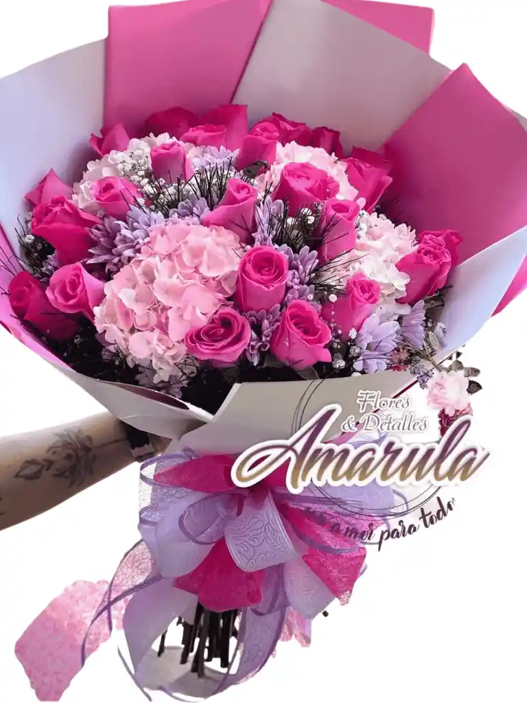 Bouquet de rosas con hortensia y follaje natural. Un diseño fresco, colorido y lleno de vida.
