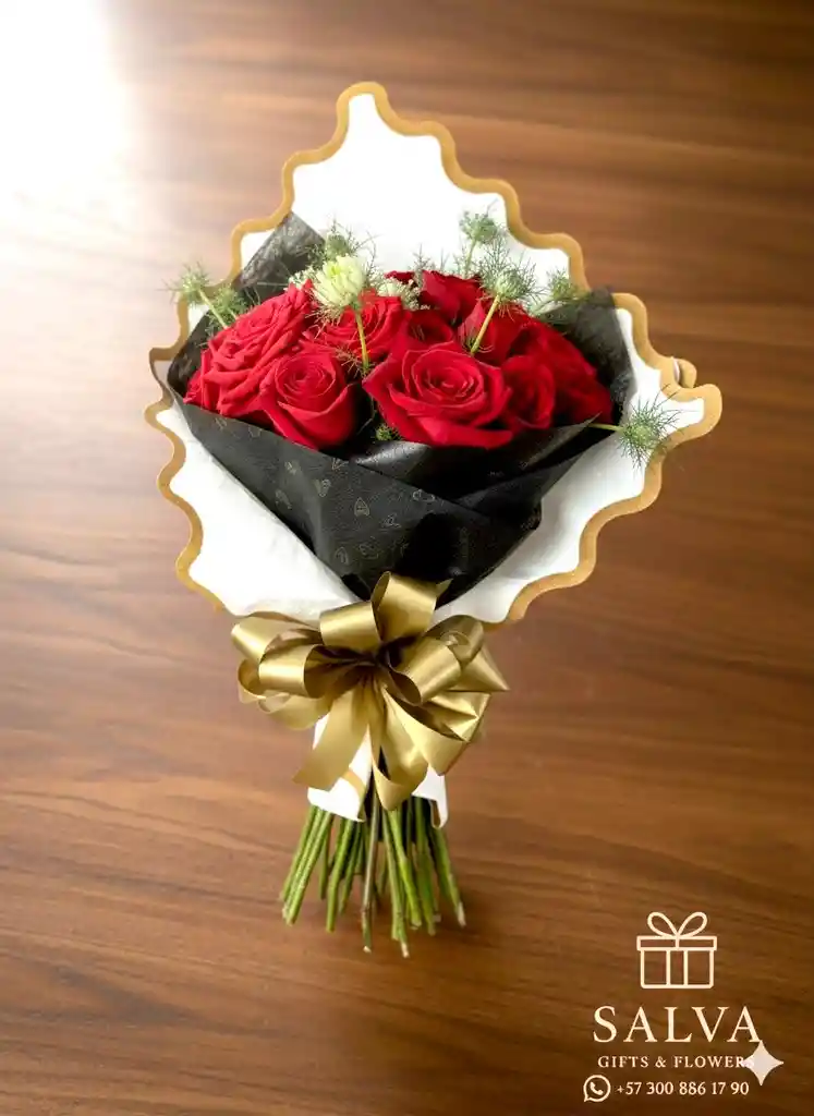 Hermoso bouquet de 18 rosas rojas, follajes y complementos. ramo de mano envuelto en finas fibras que resaltan la belleza de las flores y su elegancia ´para un detalle especial.