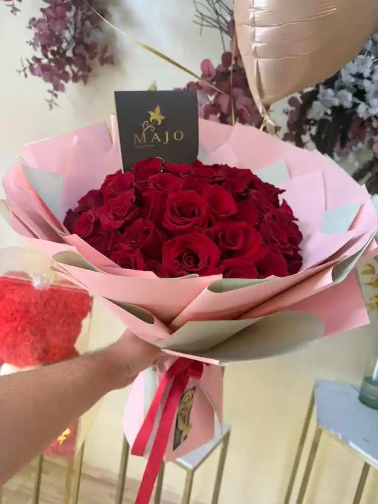 Bouquet de 24 rosas rojas, envueltas en fino papel coreano rosado: una expresión sublime de amor, elegancia y distinción. 🌹✨ Rosas de exportación
