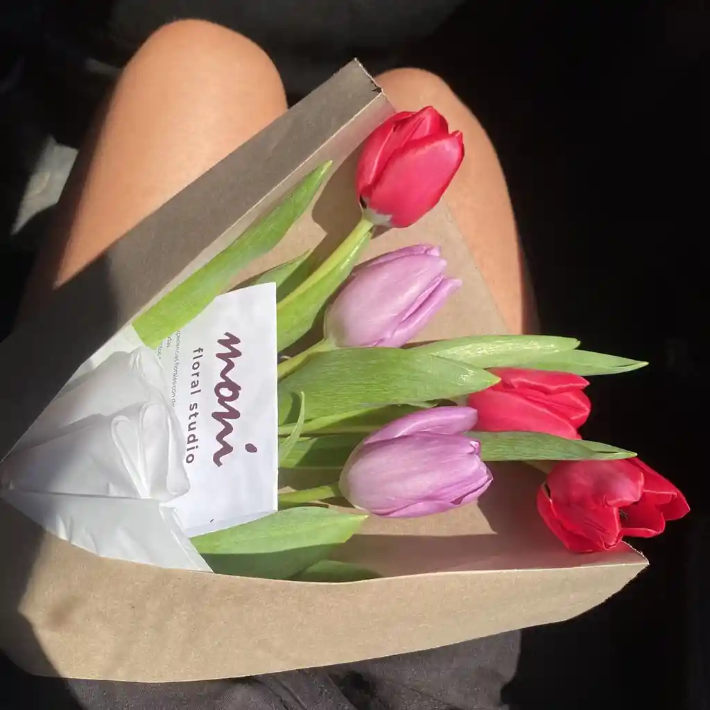 5 Tallos Tulipanes frescos según disponibilidad de colores, po favor escribir en el chat colores deseados y mensaje para la tarjeta, de lo contrario se enviará a elección de la florista