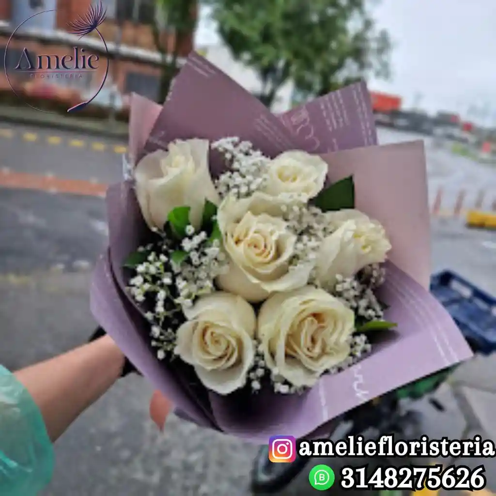 Bouquet con 6 rosas tono blanco , follaje y decoración. / Indicar personalización el arreglo floral (colores y mensaje de la tarjeta) 3148275626