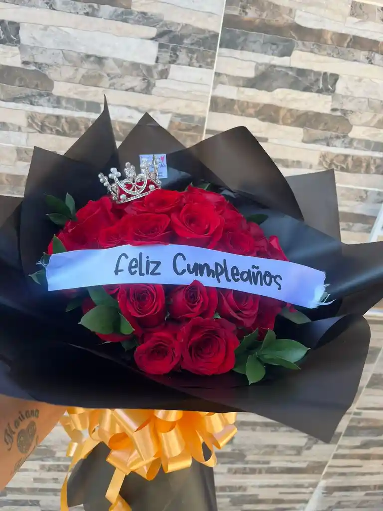 HERMOSO ARRGLO DE ROSAS ROJAS CON CORONA MARIPOSAS TARJETA PERSONALIZADA EN VUELTO EN PAPEL KOREANO Y CINTA DE CUMPLEAÑOS