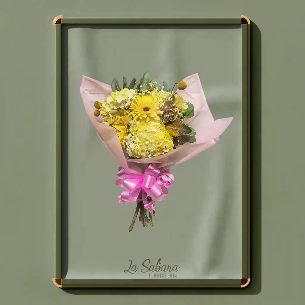 Arreglo de hermosas hortensias amarillas acompañadas con follajes silvestres