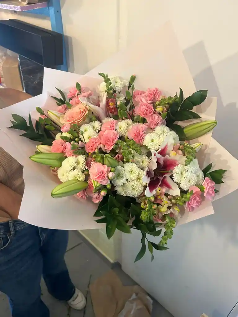 Bouquet con lirios, boca de dragón, mini clavel y crisantemo. (incluye follaje y papel)