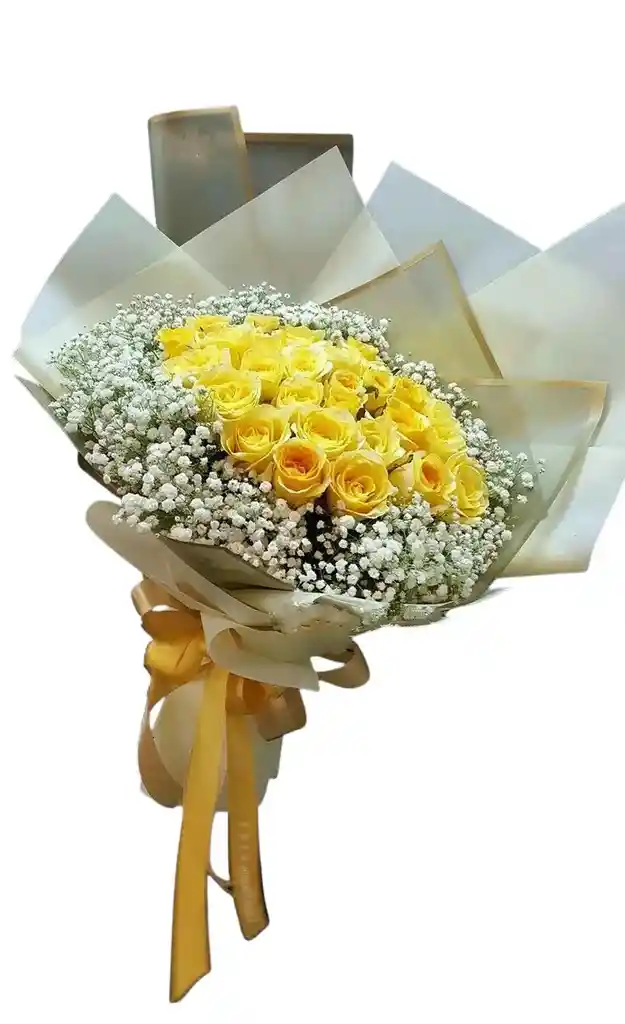 Bouquet de 12-18 rosas amarillas aproximadamente con gypsophila. La flor puede ser sustituida dependiendo la disponibilidad de color y del producto “Mensaje Personalizado” máximo de 30 caracteres (Dejar el mensaje en el chat, los comentarios no se previsualizan para la tienda por lo que si se dejan allí no podrá ser incluido)