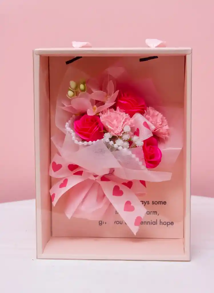 Este encantador arreglo floral artificial se distingue por su paleta de colores suaves, presentado en una caja de regalo cuadrada de un elegante tono rosa claro o blush. El bouquet encapsulado está compuesto por una mezcla de flores en rosa fucsia (como rosas) y rosa pálido (como claveles), complementado con delicados acentos de flores blancas (tipo velo de novia) y una guirnalda de perlas decorativas que añaden un toque de distinción. El conjunto está envuelto en papel translúcido y asegurado con un gran lazo de cinta rosa decorado con corazones de un tono más intenso, confiriéndole un estilo sumamente romántico y tierno, mientras que el interior de la caja porta un mensaje impreso que subraya el sentimiento cálido y esperanzador del obsequio.