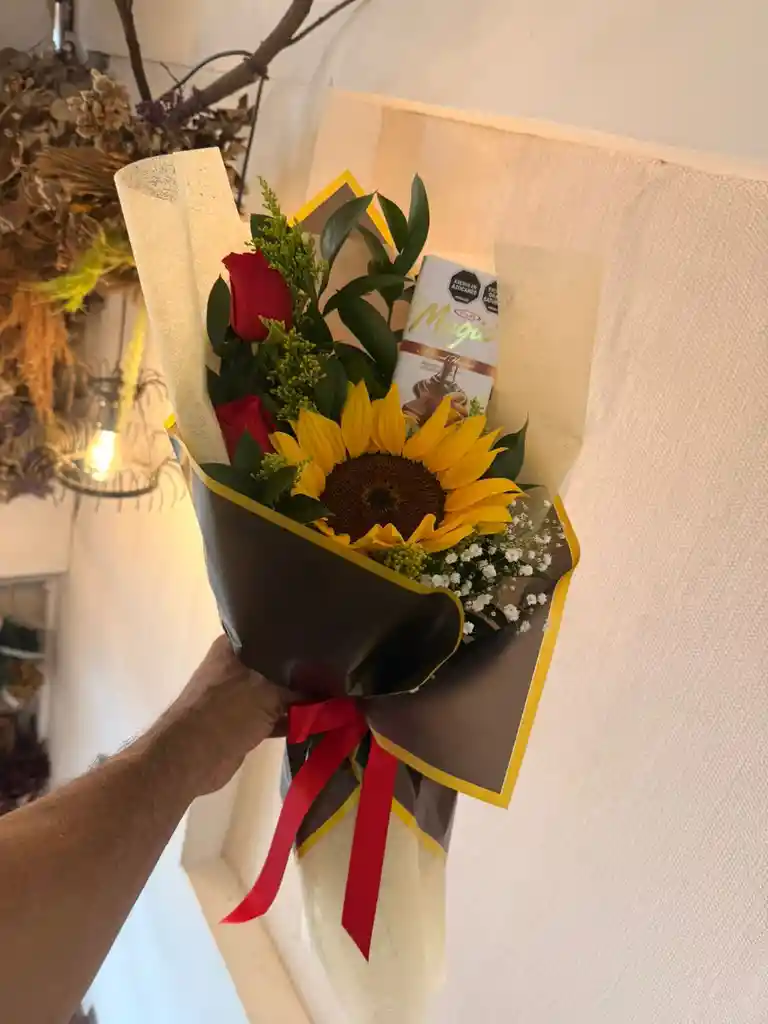 1 girasol, 2 rosas rojas, 1 cusco, 1 gipsofilia, 1 chocolatina magic
