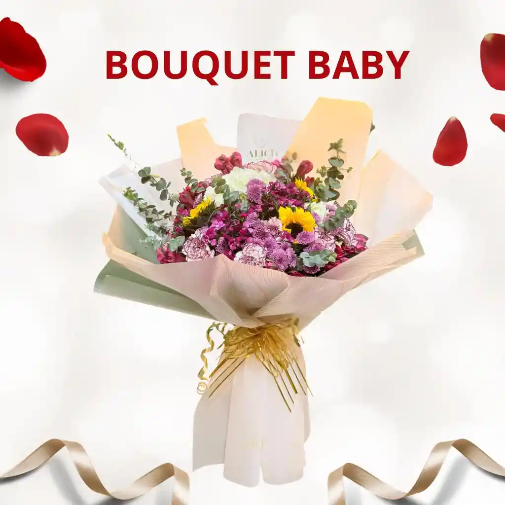 ARREGLO FLORAL TIPO BOUQUET EN PAPEL COREANO CON MIX DE FLORES SURTIDAS DE MANERA ELEGANTE