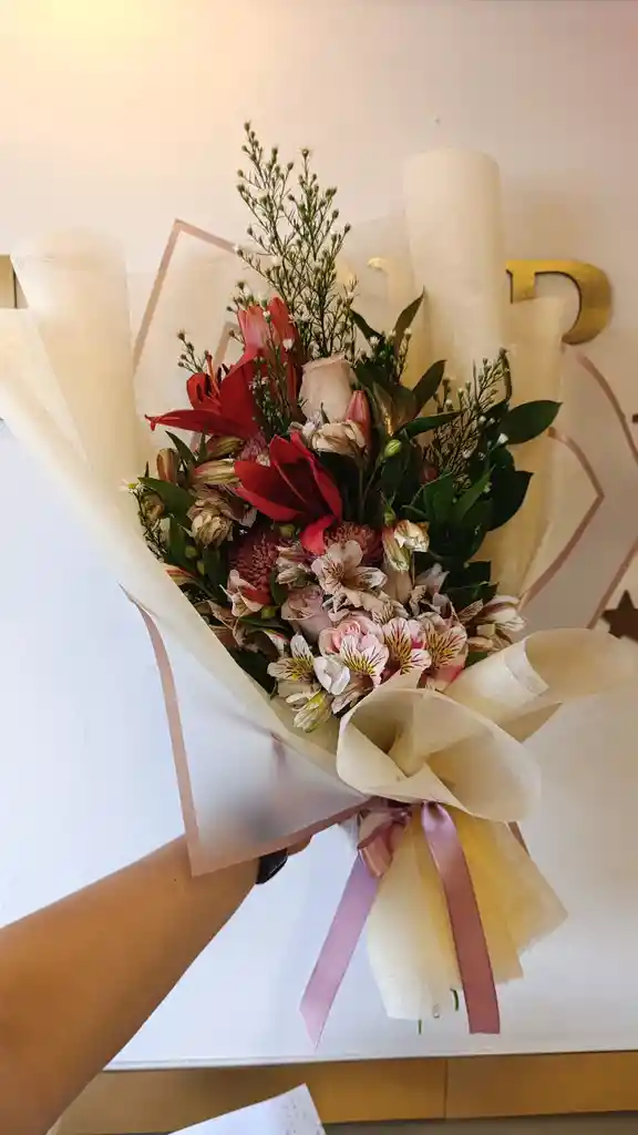 Aster blanco, lirio rojo, astromelia, rosa, clavel, rusco