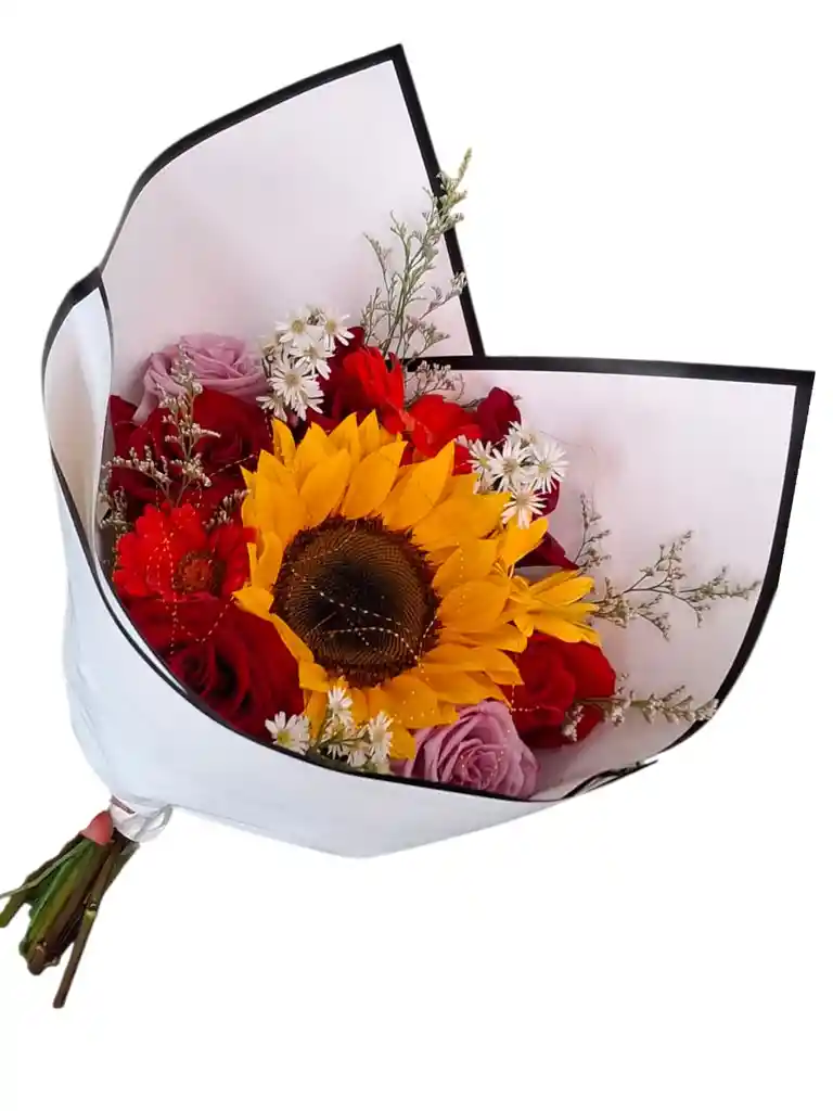 Bouquet de Rosas colores , Girasol y demás flores de temporada una forma perfecta para demostrarle tu amor y sentimientos mas sinceros , conquístala y sorpréndela con este hermoso detalle.