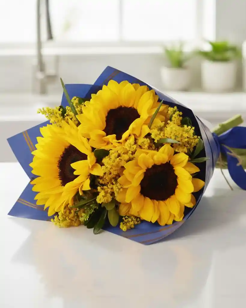 Un diseño imponente que celebra la vida con intensidad. Contiene 10 girasoles frescos y radiantes, cuidadosamente dispuestos en una caja con forma de corazón (color sujeto a disponibilidad). Características Bouquet de gran impacto visual, lleno de fuerza y luminosidad. Incluye girasoles frescos combinados con follajes verdes y amarillos. Un regalo que irradia energía positiva y gratitud en grande. Beneficios Los girasoles simbolizan vitalidad y alegría expansiva. Ideal para grandes celebraciones, transmitir apoyo o llenar ambientes de luz y esperanza.