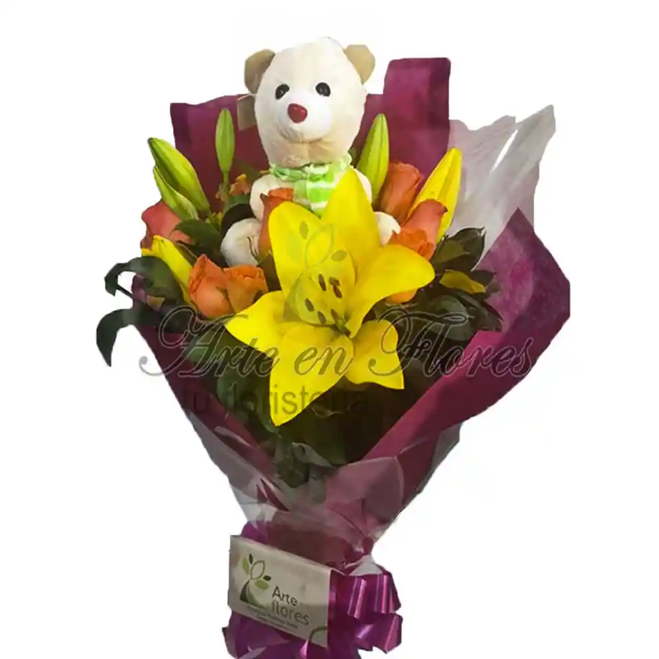 Este arreglo esta elaborado con: 6 Lirios ( El color de los lirios pueden variar) 6 Rosas ( El color de la rosa puede variar) Peluche Follaje verde Moño Decoración