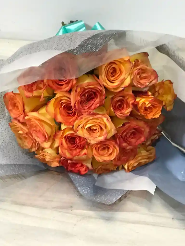 Hermoso bouquet compuesto por de 24 rosas color confetti acompañado con ruscus.