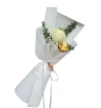 Bouquet de 1 rosa blanca y 1 ferrero con follaje, papel y moño