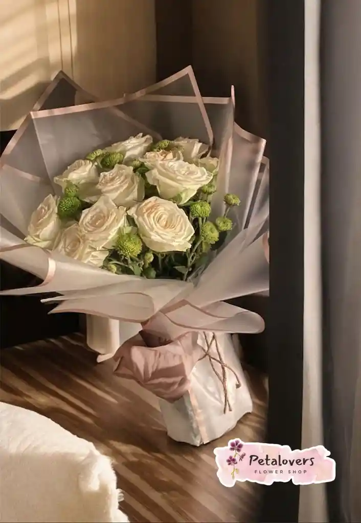 Este elegante bouquet floral incluye 10 rosas blancas frescas, seleccionadas cuidadosamente para garantizar su...Ver más