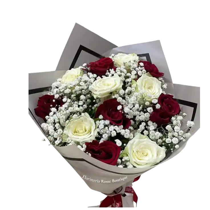 Hermoso bouquet de 12 rosas combinadas en rojo y blanco, acompañado de delicada yipsofilia que realza su elegancia y romanticismo. Incluye decoración y tarjeta personalizada Ideal para aniversarios, reconciliaciones o momentos especiales donde se quiere expresar un amor sincero.