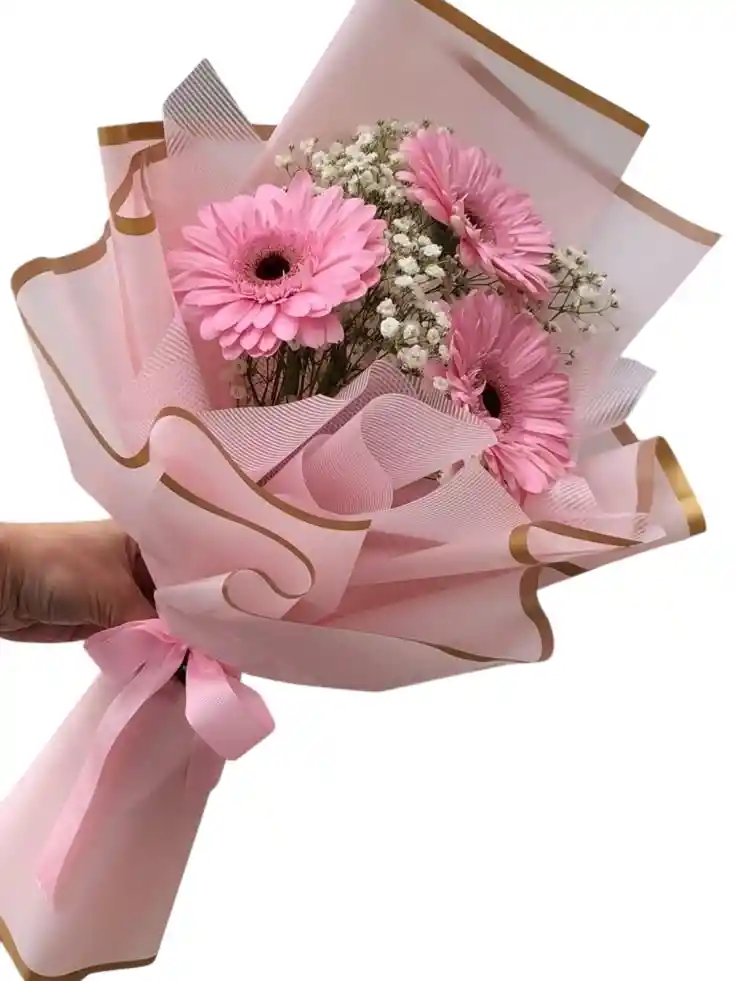 es una pieza delicada y alegre, ideal para iluminar el día de alguien con un gesto lleno de frescura. El diseño destaca por tres gerberas en un suave tono rosa pastel, dispuestas de forma escalonada para resaltar su belleza natural. Acompañadas por abundantes nubes de gipsofila que aportan una textura etérea y romántica