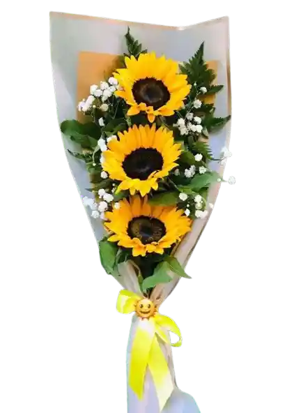Contiene: Un hermoso bouquet de 3 girasoles con follajes estilo cascada, incluye decoracion y tarjeta personalizada Ilumina cualquier momento con este encantador bouquet de 3 girasoles en diseño cascada, creado para transmitir felicidad, vitalidad y admiración. Cada girasol irradia luz y energía positiva, mientras la forma en cascada aporta un toque elegante, natural y lleno de movimiento.