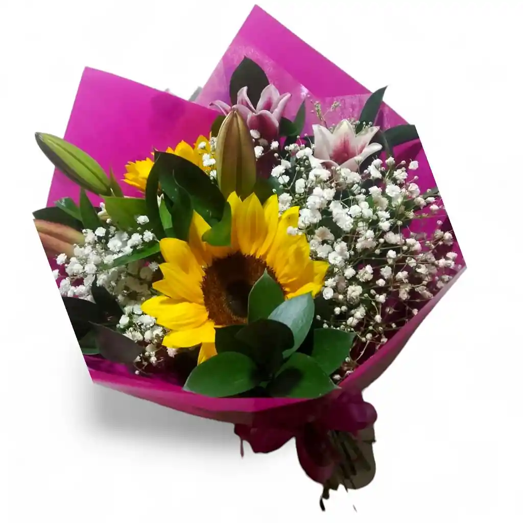 Bouquet de 3 lirios de colores 3 girasoles y follajes.