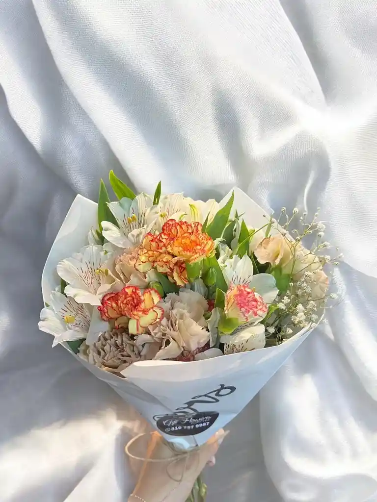 Bouquet con aprox 10 claveles 1 paquete de astromelia y gypsophila. Nota: La flor puede ser sustituida dependiendo la disponibilidad de color y del producto “Mensaje Personalizado” máximo de 30 caracteres (Dejar el mensaje en el chat, los comentarios no se previsualizan para la tienda por lo que si se dejan allí no podrá ser incluido).