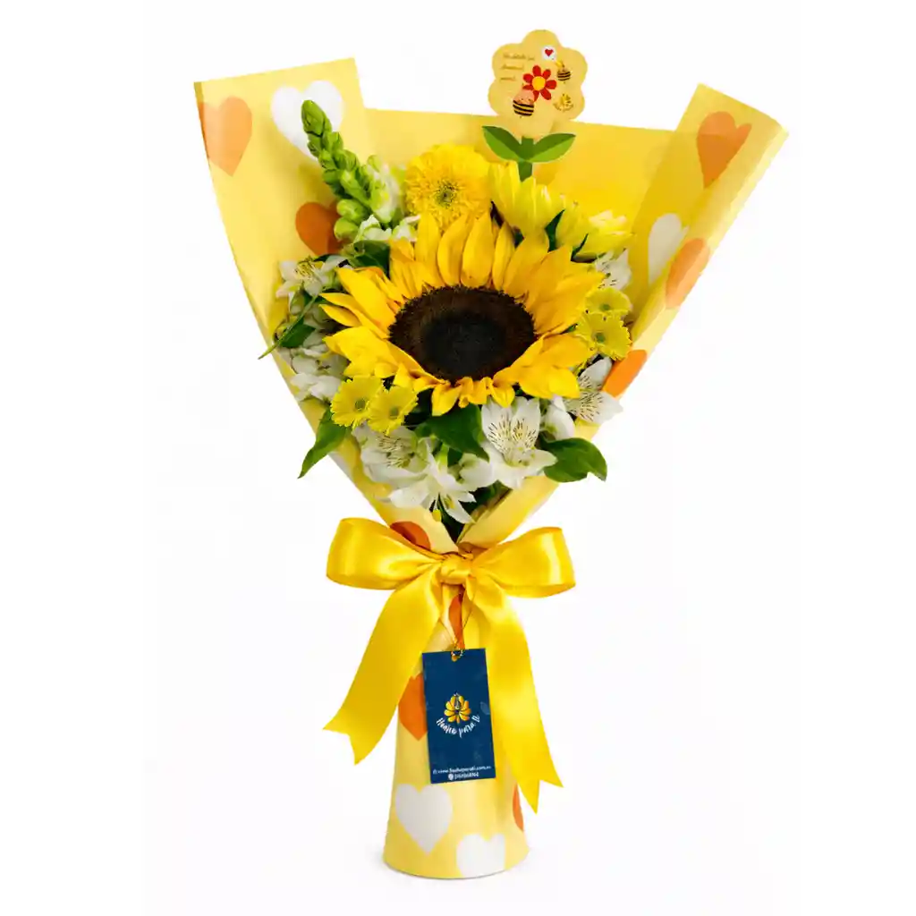 Un detalle lleno de significado para la temporada de regalar flores amarillas, que simbolizan alegría, esperanza y nuevos comienzos. Este bouquet combina un hermoso girasol con delicadas flores amarillas y blancas, follaje fresco y una envoltura especial en tonos amarillos con moño decorativo, creando un regalo luminoso y especial para sorprender a alguien importante en esta fecha tan especial. 💛🌻