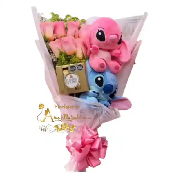 bouquet por 8 rosas, chocolate por 4 unidades, pareja de stichs pequeños, papel decorativo, moño y tarjeta con mensaje, si deseas un mensaje para la tarjeta lo puedes dejar escrito en el área de observaciones o escribirnos al whatsapp al 3143111616 y enviarnos el mensaje para la tarjeta.