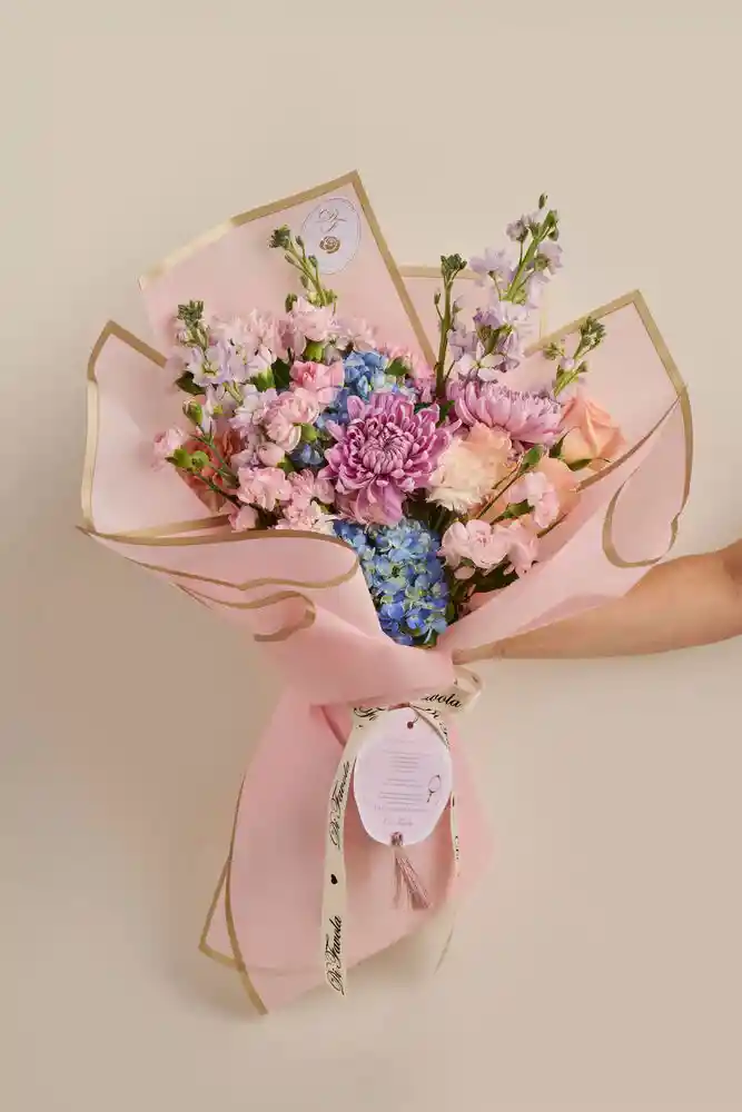 Composición floral luminosa y sofisticada, inspirada en la suavidad del amanecer. Incluye rosas de exportación en tono durazno, crisantemos lila, hortensias azul suave, boca de dragón y alelí, cuidadosamente seleccionadas para crear una armonía de matices rosados, lila y azul. Su combinación transmite serenidad, calidez y carácter, convirtiéndolo en un detalle que honra la esencia y la luz de la mujer que lo recibe. Presentado con tarjeta especial. Incluye: - Arreglo floral - Instrucciones de cuidado - Tarjeta dedicatoria - Tarjeta especial edición Día de la Mujer Jardín de Luz y borla decorativa