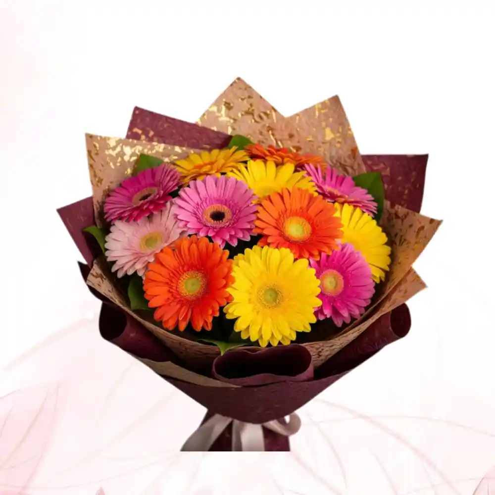 Incluye gerberas frescas de colores surtidos, acompañadas de follaje natural y una presentación delicada, perfecto para cumpleaños, agradecimientos o para alegrar cualquier espacio.
