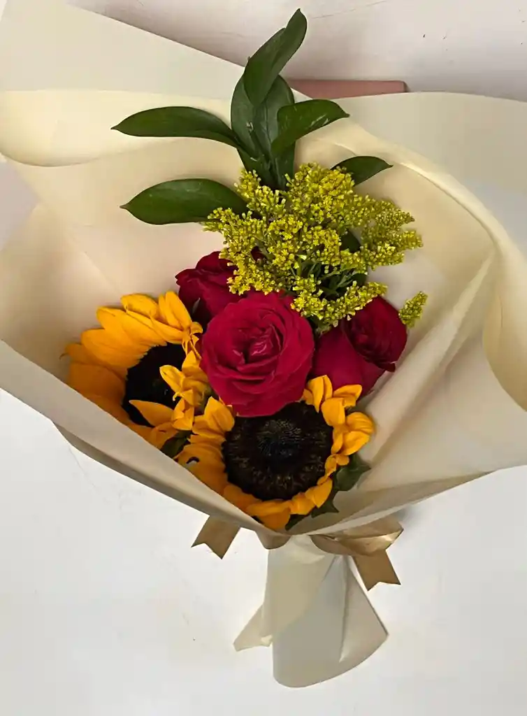 Bouquet de girasol con rosas rojas