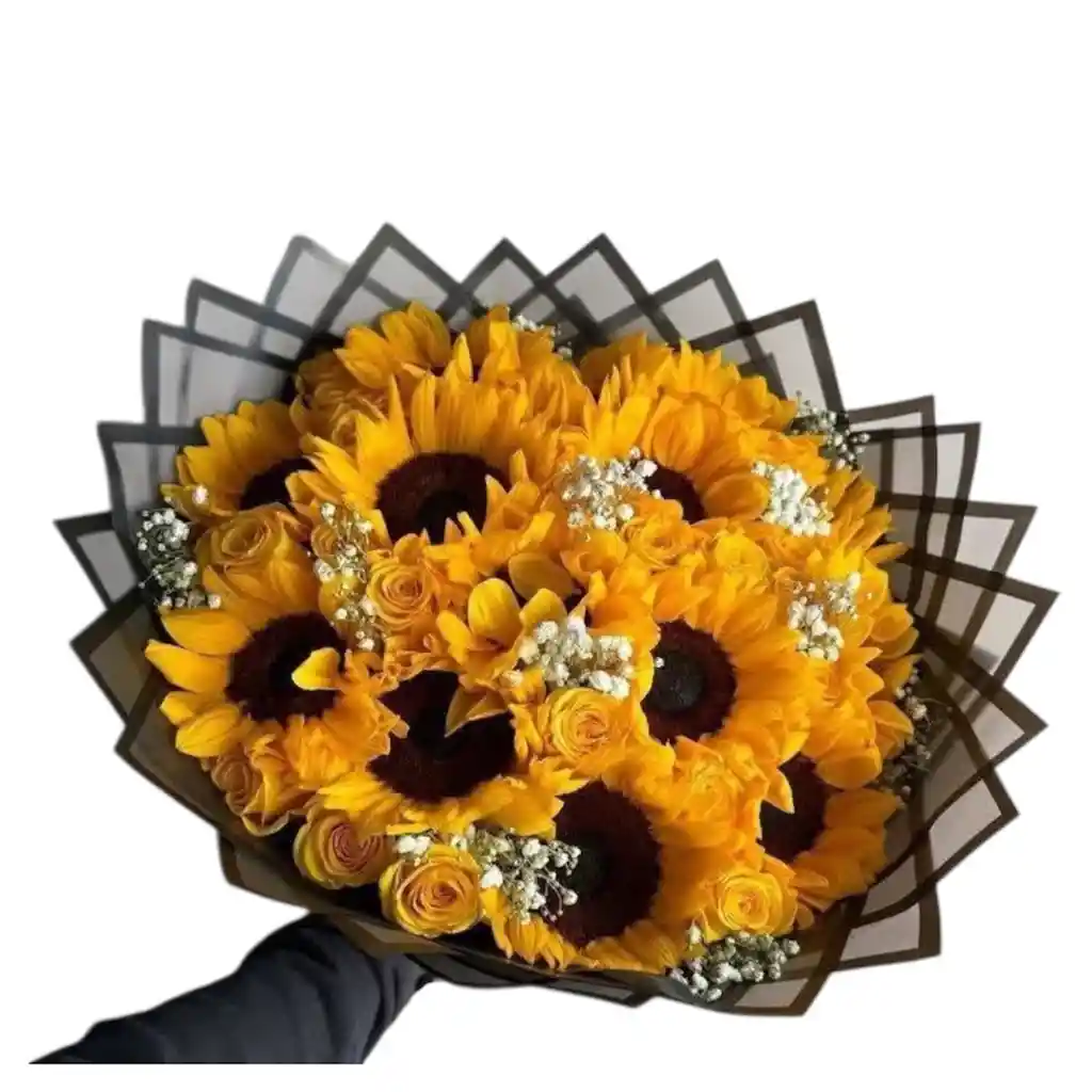 Bouquet de girasoles con rosas amarillas , gipsofilia envuelto en papel coreano