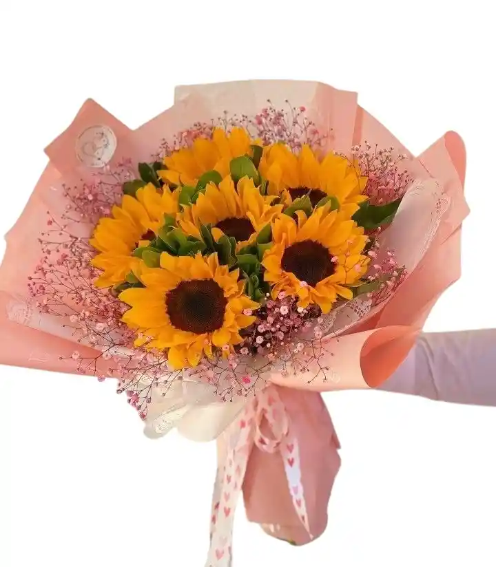 hermoso bouquet de 6 girasoles y gipsu acompañado de papel coreano y cintas un detalle que inspira amor y ternura para hacer sonreír a esa persona especial que ilumina tus días