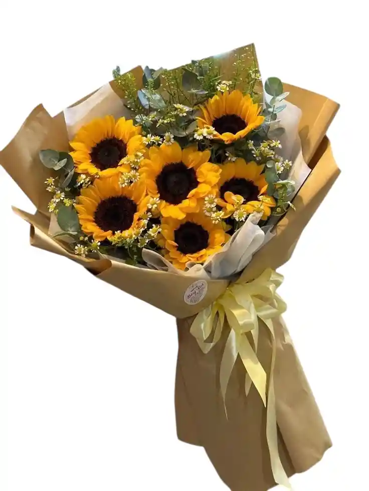 Hermoso bouquet de girasoles premium con follaje de rusco y aster, envuelto en hermoso papel coreano, ideal para impresionar a esa persona especial