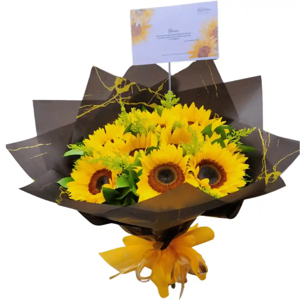 Hermoso arreglo floral en forma de bouquet de girasoles con moño decorativo, perfecto para toda ocasión.