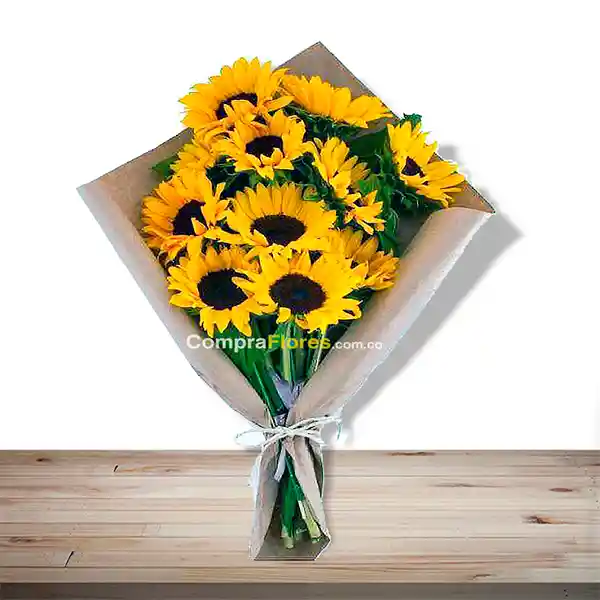 Bouquet de 12 girasoles con fino follaje. Detalles decorativos: papel craft,moño y tarjeta. color Amarilla perfectas para el Agradecimiento